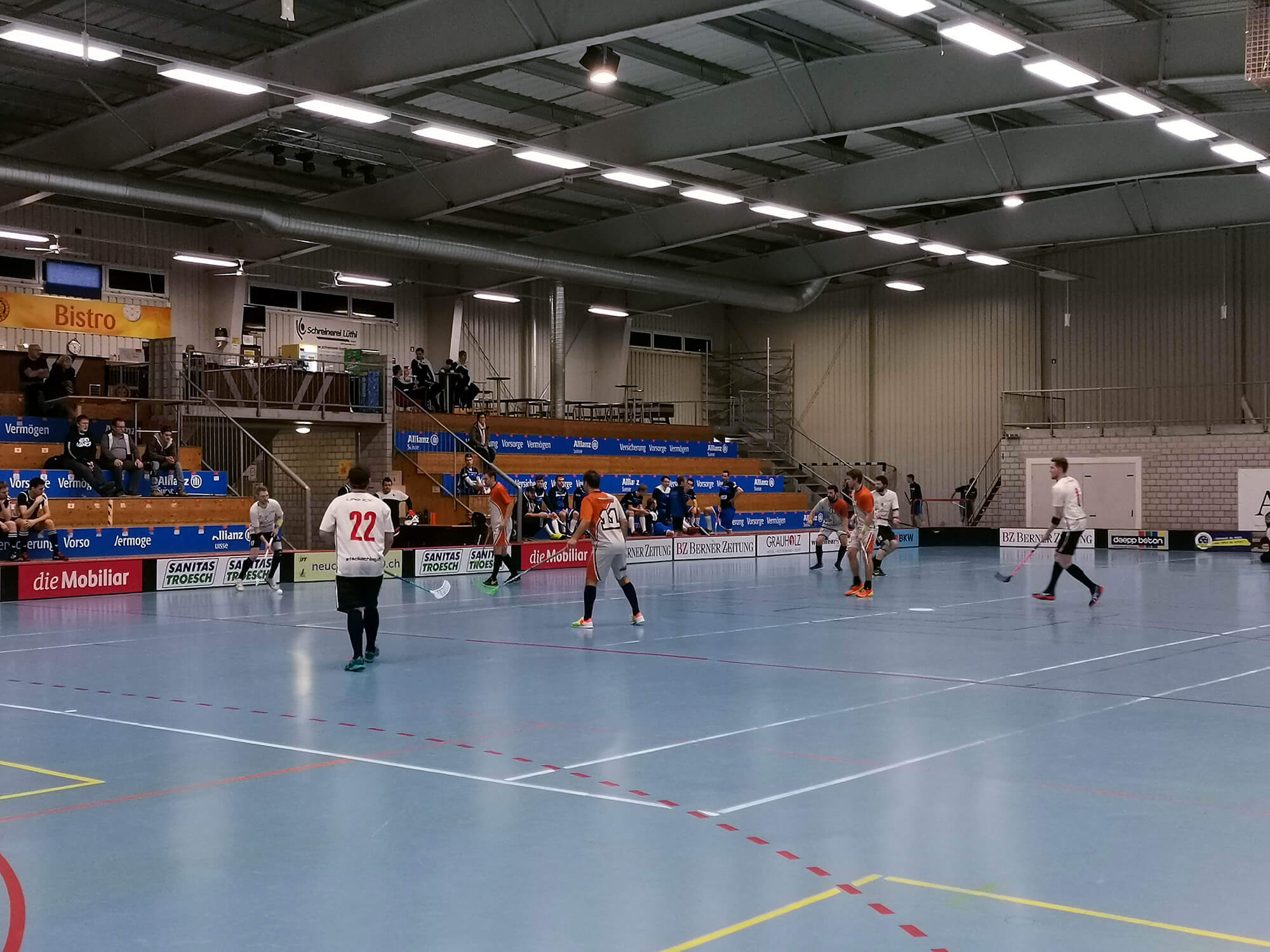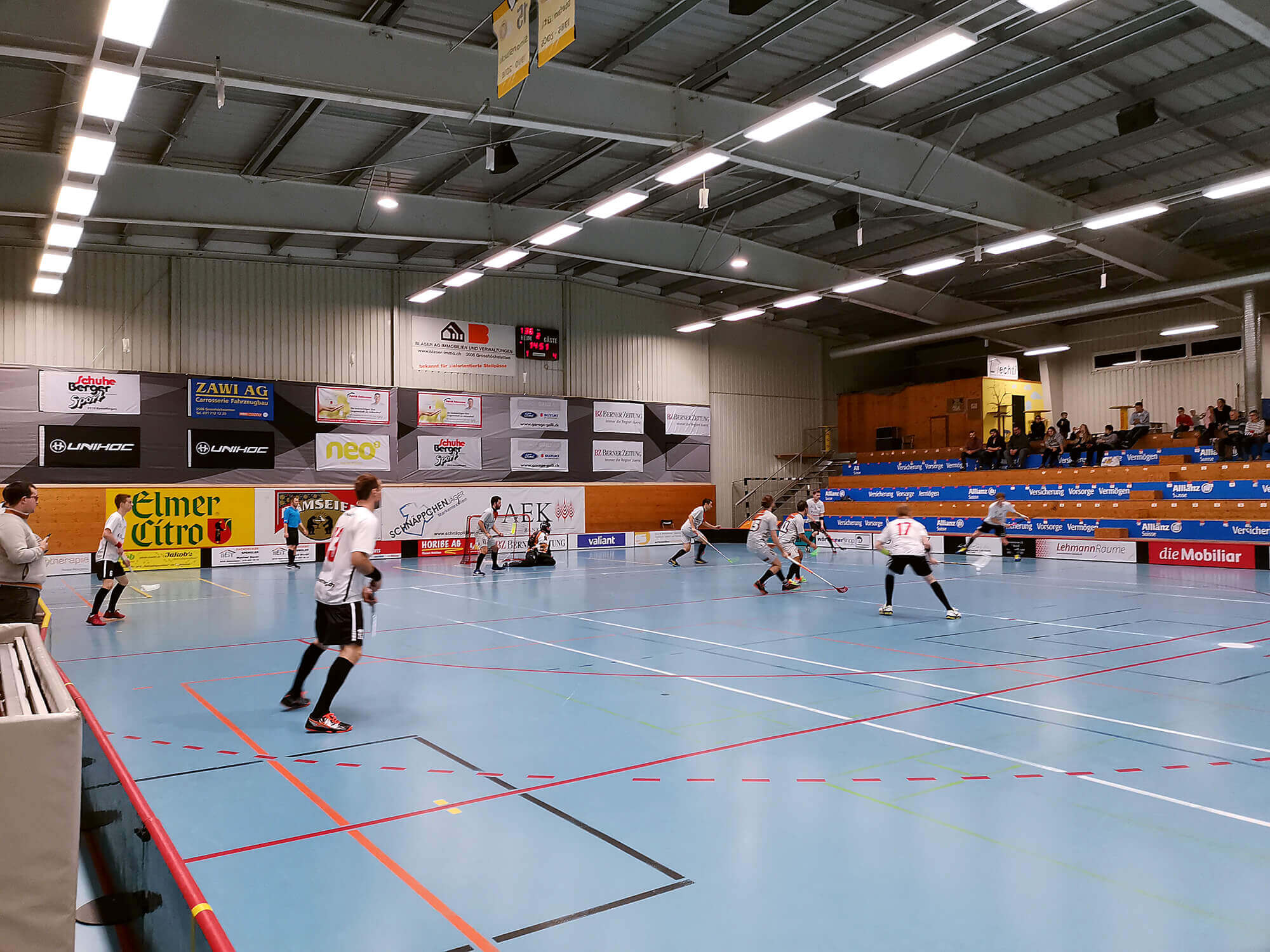 Der Start verlief alles andere als schläfrig. Uetigen spielte in den ersten Minuten stark auf und machte früh Druck auf die Entlebucher Spieleröffnung. Je länger das Spiel dauerte, desto abgeklärter wurden die Entlebucher. Der Gegner versuche immer wieder mit hohen Bällen in die Zone der Schüpfheimer zukommen. Diese Angriffe konnten vorerst abgewehrt werden. Schüpfheim spielte ebenfalls gut mit, konnte aber zu Beginn noch keine Top-Chancen herausspielen. Nach rund 10 Minuten klingelte die Torsirene das erste Mal und spätestens jetzt war auch der letzte Zuschauer hellwach. Uetigen erzielte mittels Weitschusses das frühe 0:1. Schüpfheim wurde nach diesem Paukenschlag stärker. In der Offensive konnten sie sich oft festsetzen und der Ball lief schnell und gut. Nach einem guten Forechecking konnte der Ball einem Gegner abgeknöpft werden. Jan Bucher legte den Ball zurück auf Pascal Grüter, welcher als Verteidiger den Ball in die Maschen knallte. 1:1 Ausgleich. Der Ausgleichstreffer fiel 40 Sekunden vor der Pausensirene. Mit einem gerechten Unentschieden ging es in die erste Pause bzw. zum Morgenkaffee.