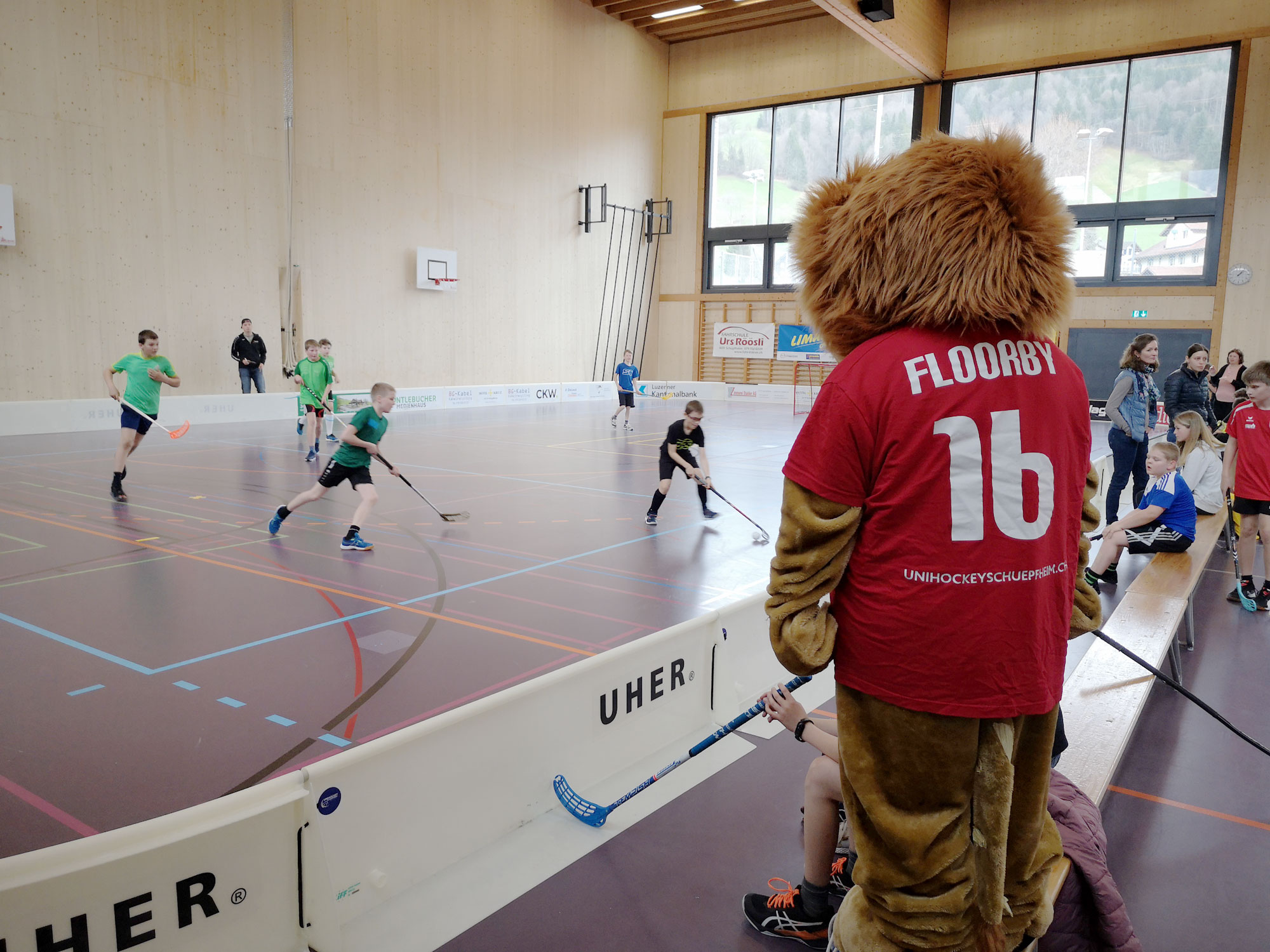 Am Samstagmorgen trafen bereits am frühen Morgen die ersten strahlenden Kinder in die Dreifachturnhalle Moosmättili ein, um sich auf die Spiele des Schülerturniers vorzubereiten. Um 8.00 Uhr war es dann endlich soweit, die ersten Gruppenspiele der jüngsten Kategorien der Unterstufe wurden angepfiffen. Auf zwei Spielfeldern wurde über 11 Spielminuten um jeden Ball gekämpft, um diesen über die gegnerische Torlinie zu befördern. Neben den Spielfeldern wärmten sich die restlichen Teams ein, besprachen die Taktik oder tankten Kräfte für die nächsten Spiele. Bereits am frühen Vormittag fanden die ersten Finalspiele statt. Die besten Teams aus den Kategorien der Unterstufe wurde gesucht. Die Stimmung war riesig. Auch das Maskottchen Floorby unterstütze die Teams am Spielfeldrand tatkräftig. Während die einen bereits über den Sieg jubeln durften, hiess es für die in der Zwischenzeit eingetroffenen Teams der Mittelstufe höchste Konzentration auf die Gruppenspiele. Während in der Turnhalle bereits den ganzen Morgen der Betrieb auf Hochtouren lief, war dies spätestens gegen den Mittag auch am Kiosk zu spüren. Die Helfer/-innen verwöhnten die Teilnehmer-/innen und zahlriech erschienene Zuschauer/-innen mit leckeren Hotdogs, Sandwiches, diversen Getränken und Süssigkeiten.