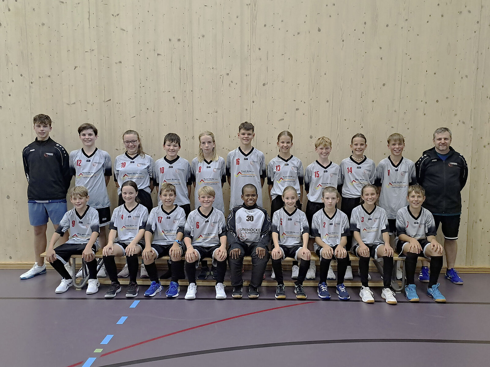 Vorne (von links): 9 Leon Emmenegger, 4 Luana Schöpfer, 17 Fabian Müller, 6 Dario Zemp, 30 Jeremy Onkhao, 5 Ivana Flühler, 2 Christian Felder, 3 Michaela Eicher, 7 Severin Müller